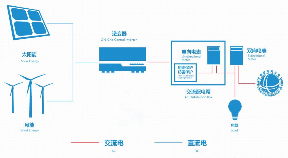 太阳能电池板将阳光转换为直流电经逆变器逆变为市电提供给负载使用或者并入公网。